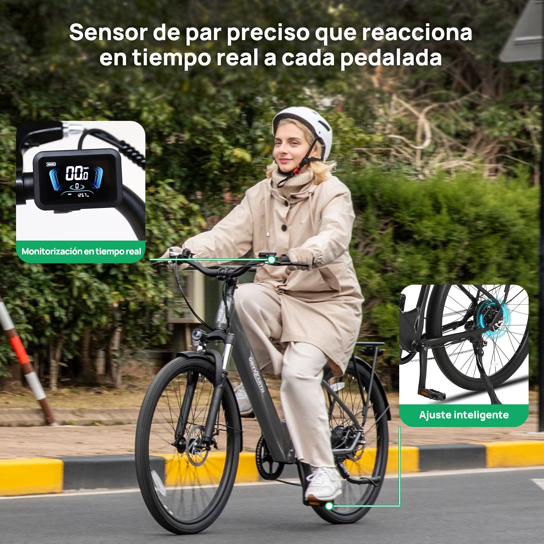 La bicicleta eléctrica urbana Oryxearth cuenta con un sensor de torsión que convierte cada movimiento del pedal en asistencia motorizada continua. Esto garantiza una aceleración instantánea, subidas sin esfuerzo y una experiencia de conducción perfectamente sincronizada con su esfuerzo. Ofrece una experiencia de conducción más natural y receptiva en comparación con las bicicletas eléctricas con sensores de cadencia.